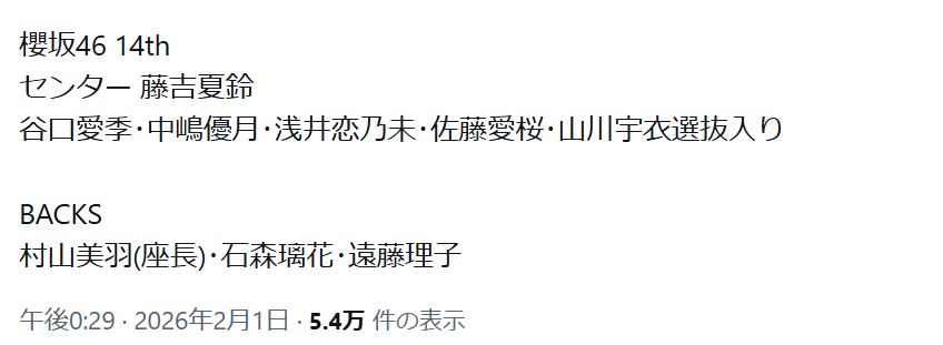• センター:発表前から「藤吉夏鈴(るんちゃん)」が有力候補として多く挙げられていました。Xや5chで「二期生回帰で国立に向けて強いセンター」「藤吉がセンターで的中した」というポストが多数。結果、公式で藤吉夏鈴がセンターに決定。リークはほぼ的中していました。